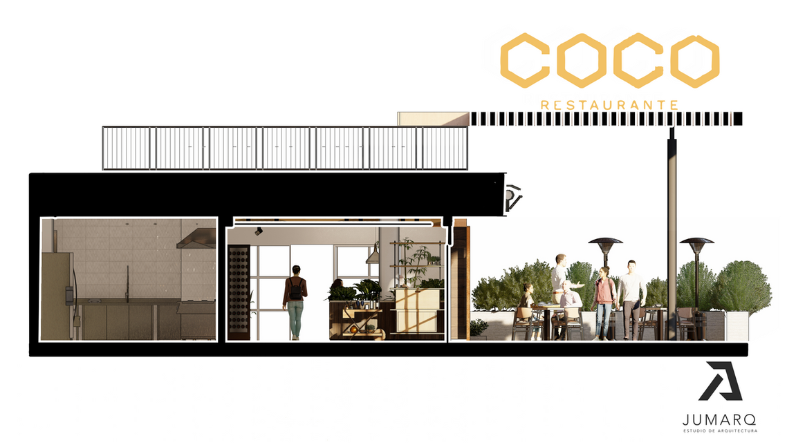 El restaurante Coco V2 es un diseño que retoma el material estilístico establecido por un briefing suministrado por los propietarios de este negocio, para ello fue necesario identificar la espacialidad existente e interpretar las características principales para que este espacio fuera atractivo al público, entre estas características, a diferencia del diseño preliminar, poseíamos un mayor numero de entradas y disponíamos de una fachada más amplia que permitió exponer al máximo el área disponible a sus comensales.